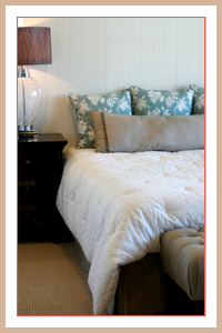 I noticed this bedroom online and just had to write about it. The thing I like the best isn’t the decor, it’s the wall. You’ll notice it’s wood paneling that’s been painted white, this is an excellent way to freshen up a room. I would have liked to see some artwork above the bed with the softened blues similar to the pillows.