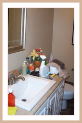 Remember to clear off your bathroom counter tops when selling your home. Freshen up the room by removing any items not required and even if your bathroom is clean touch up the toilet bowl, tank, sink, taps, vanity, mirrors and walls. Add some floral accents to complete the look.